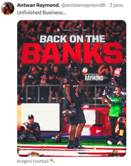 Dans un paysage du football universitaire bouleversé par le portail des transferts, où les joueurs étoiles changent fréquemment d’institution en quête de meilleures opportunités ou d’arrangements financiers plus avantageux, Antwan Raymond a fait un choix remarquable. Le 3 janvier 2026, alors que le portail des transferts venait d’ouvrir ses portes, Raymond a annoncé sur les réseaux sociaux son retour à Rutgers pour la saison 2026 avec un message simple mais éloquent : « Unfinished Business » (mission inachevée).