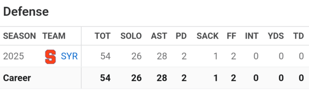 La saison 2025 de Syracuse n’a pas été celle espérée par les partisans. Avec une fiche de 3-9, les Orange ont connu des difficultés offensives et défensives tout au long de l’année. Dans ce contexte difficile, Deslauriers s’est démarqué comme l’un des rares points positifs de la défense.
