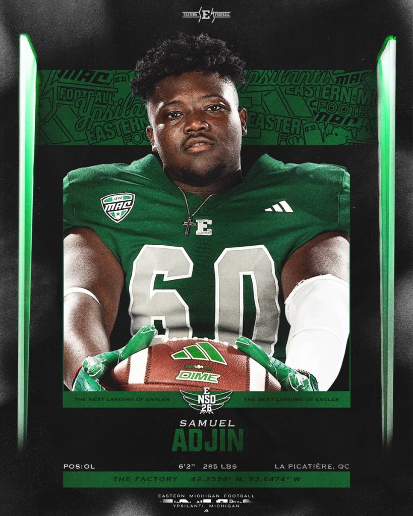 Il y a des parcours qui commencent loin des projecteurs. Celui de Samuel Adjin a débuté sur les terrains du Bas-Saint-Laurent, dans une région où le football est une passion communautaire bien ancrée, mais rarement un tremplin vers la division 1 américaine. Aujourd’hui, ce joueur de ligne offensive de 20 ans s’apprête à rejoindre les Eagles d’Eastern Michigan University, dans la Mid-American Conference (MAC), avec en poche une bourse d’études complète évaluée à six chiffres.